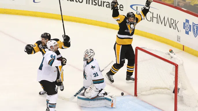 Sharks defenseman Justin Braun tied it with 4:05 left in regulation but San Jose fell to 0-4 when pushed to overtime in the playoffs. Sidney Crosby won a faceoff in the San Jose zone and dropped it to Kris Letang. Letang feigned a shot and instead fed it to Sheary, who quickly whipped it by Jones for his fourth of the postseason and second of the series.