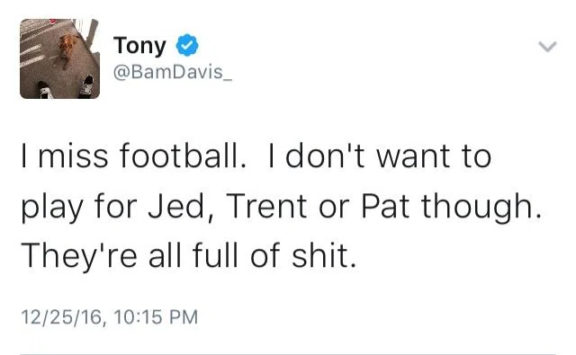 As he’s known to do, former 49ers offensive tackle Anthony Davis took to Twitter on Christmas Day, to give his takes on San Francisco’s front office and head coach Chip Kelly.
