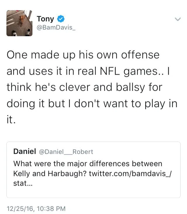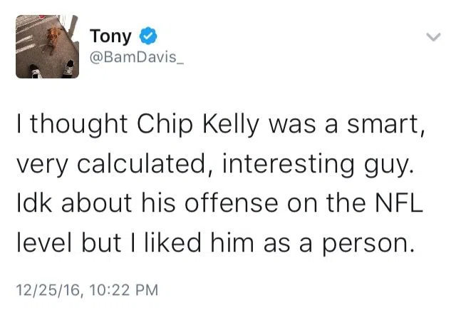 Somewhat surprisingly, Davis went on to praise Kelly as a person, though didn’t exactly endorse his offensive scheme. One of the biggest criticism’s levied at Kelly during his tenure with the Eagles centered around his cold demeanor and unlikeable disposition, something Davis’ comments seem to contradict.