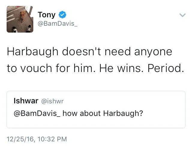 Davis, 27, was one of the better offensive tackles in the NFL before electing to retire shortly after the firing of Jim Harbaugh in early 2015. Davis went on to praise Harbaugh.