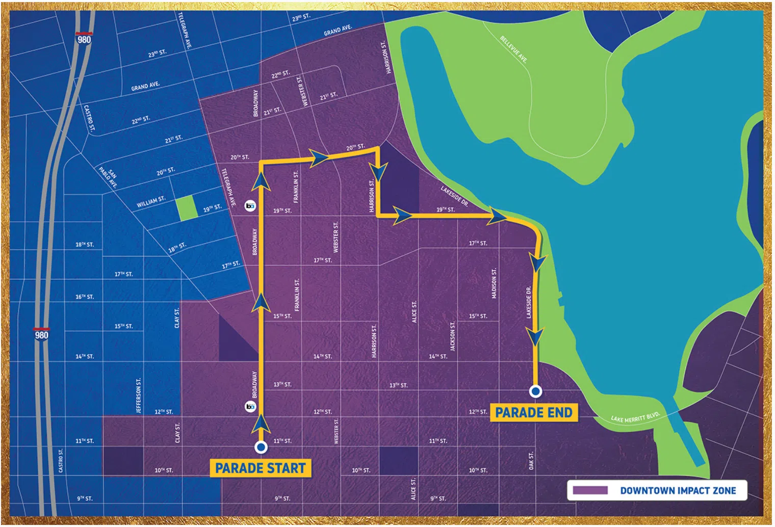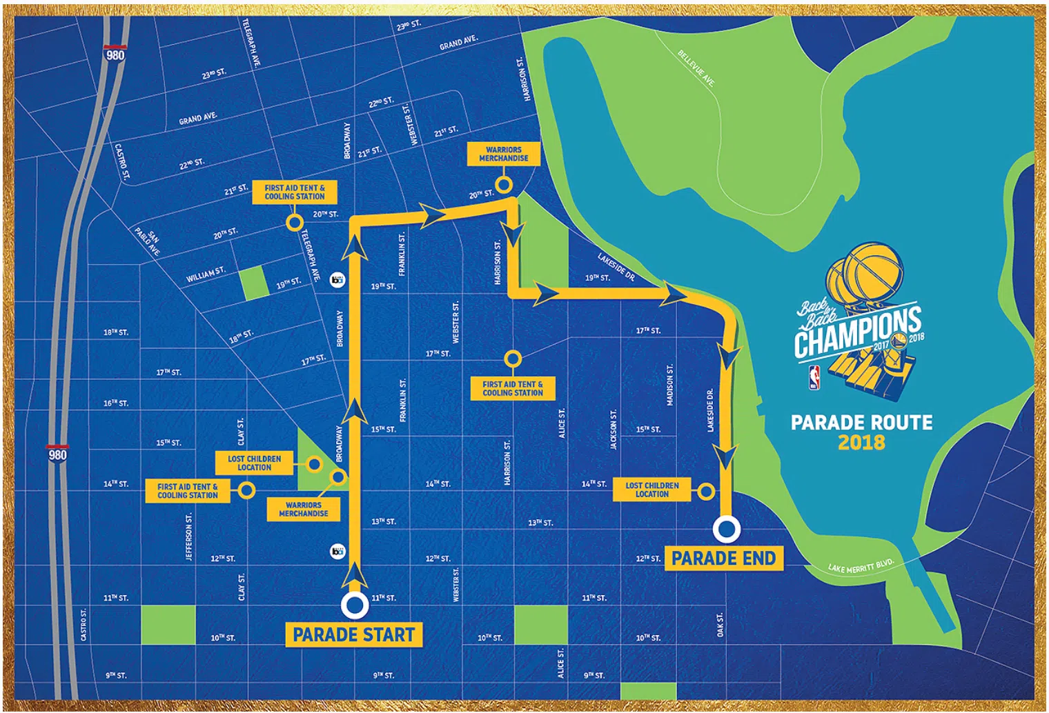 The back-to-back NBA Champion Golden State Warriors and the City of Oakland will host a Championship Parade to honor the 2018 NBA Champion Golden State Warriors on Tuesday, June 12 beginning at 11:00 a.m. The parade will begin on Broadway at 11th Street, turning right on 20th Street, turning right on Harrison to 19th Street, and right on Lakeside Drive, ending on Oak and 13th Street.