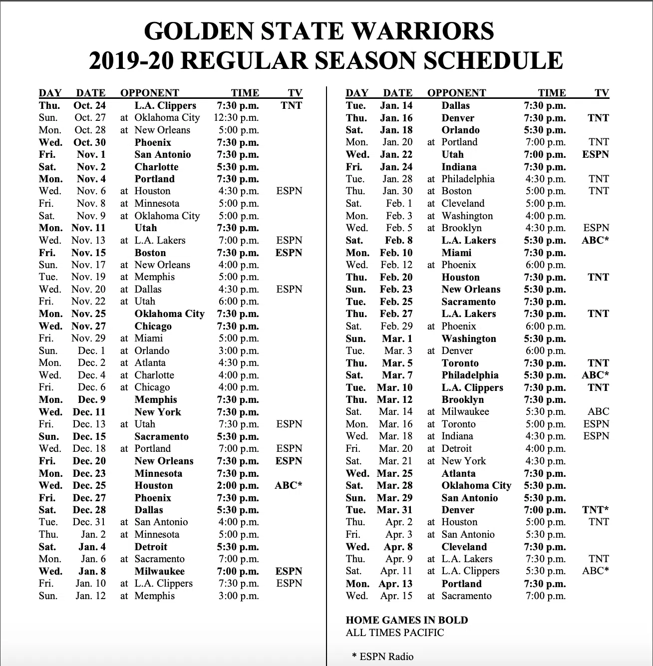 The 2019-20 NBA schedule will once again use a 30-team format (two conferences of 15 teams each, with three five-team divisions within each conference) in which teams will play each opponent within their division four times, while playing six of the remaining 10 teams in their conference four times, and the four remaining teams in their conference only three times. Teams will also play all 15 opponents outside of their conference two times each. In 2019-20, the Warriors will play only three games against the following Western Conference opponents: Dallas (two at home, one away), Denver (two at home, one away), Memphis (one at home, two away) and Minnesota (one at home, two away).