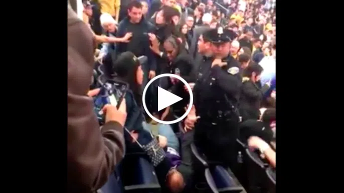 The fight broke out with around six minutes left in the game, with the Lakers leading the Warriors 112-100, at which point an officer moved in to stop it. The fan on the ground can be seen asking the officer for help getting up. The caption of the video suggests that the fan on the ground, who was wearing a purple shirt, was a Lakers fan.