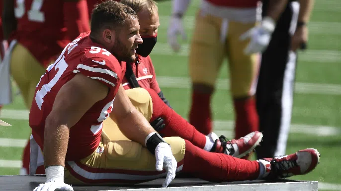 Nick Bosa’s sophomore season is over. It ended abruptly on the turf field of MetLife Stadium in the first quarter of the 49ers’ 31-13 win over the New York Jets. Bosa’s left foot got caught in the ground as he was pushed back awkwardly in an extended block from Jets tight end Trevon Wesco. He immediately reached down holding his left knee.