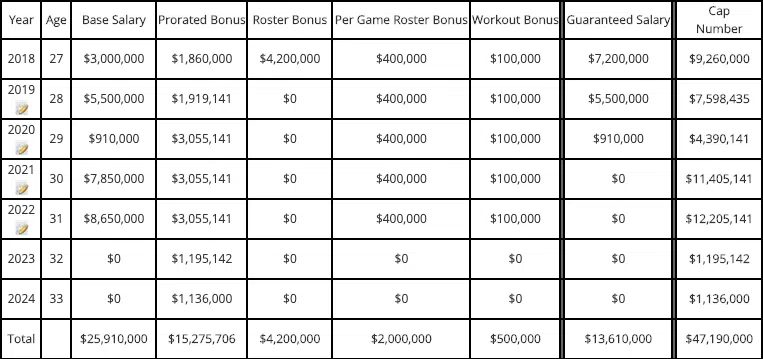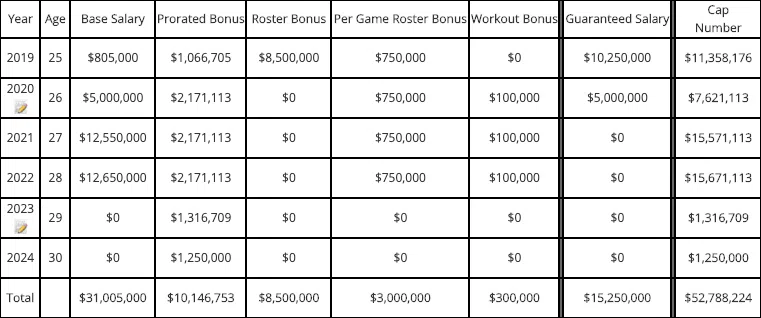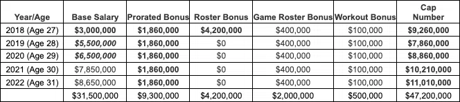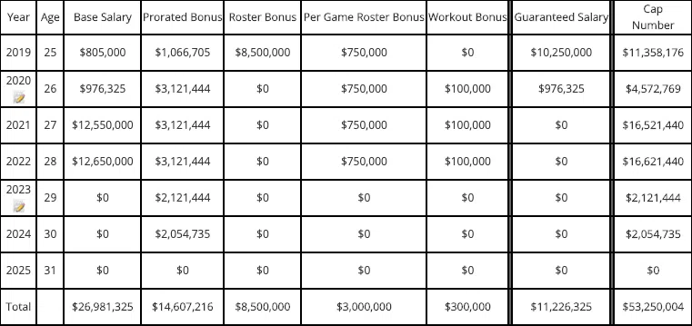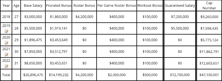 (Bold denotes guaranteed money. Bolded, italicized numbers indicate money which guaranteed on April 1 of that league year. 2019 and 2020 years were guaranteed for injury).