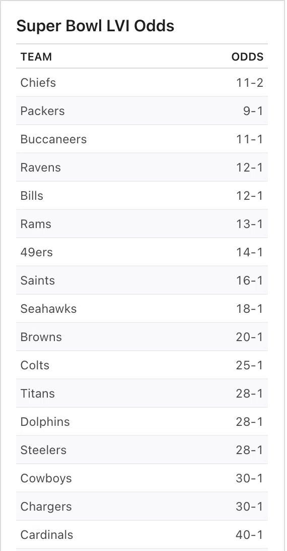 Brady of course won again on Sunday, this time with the Buccaneers, who find themselves with the third best odds (11-to-1) to repeat next season, behind the Super Bowl winning Chiefs (11-to-2) and Packers (9-to-1).