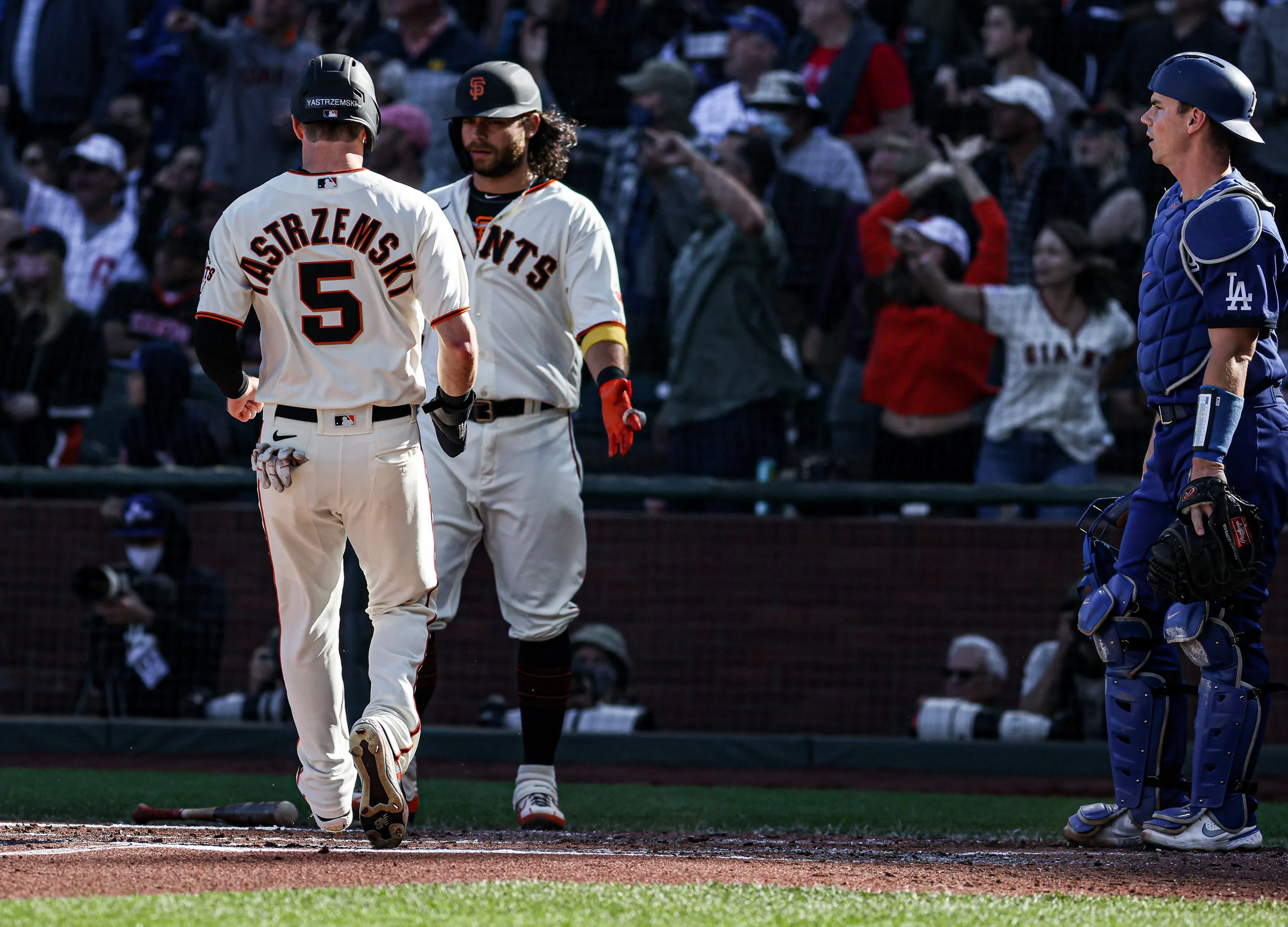 Brandon Belt got San Francisco on the board with his 21st homer of the year, a solo shot off Walker Buehler in the bottom of the first inning.