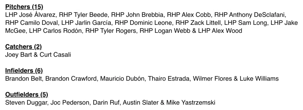The most newsworthy aspect is the absence of second baseman Tommy La Stella, who will begin the season on the Injured List as he continues to recover from Achilles surgery. He joins Evan Longoria (finger) and LaMonte Wade Jr. (knee) who will also start the season on the IL. Recent super utility signing Luke Williams gets La Stella’s spot for the time being.