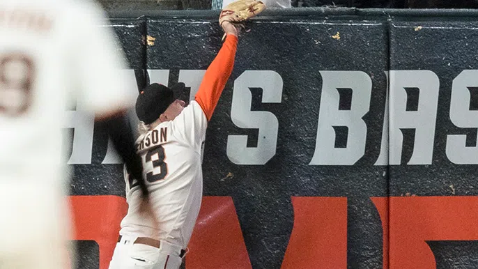 Pederson carshed into the wall and looked shaken up afterwards. He finished out the inning and he and the Giants considered keeping him in the game, but the training staff intervened.