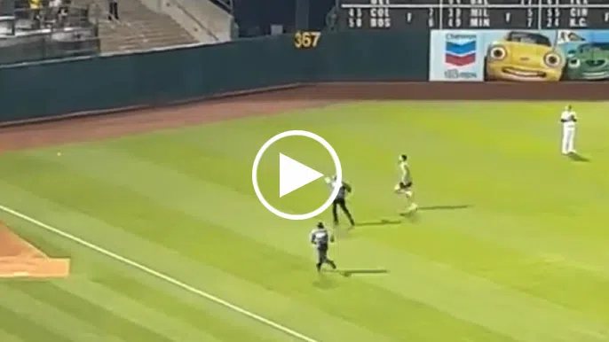 During a review of a play when Randy Arozarena was caught stealing, a fan ran on the field, getting caught on a leap just shy of the fence.