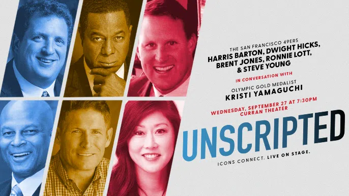 The series kicks off on Wednesday, September 27 at 7:30 p.m. with San Francisco 49ers legends Harris Barton, Dwight Hicks, Brent Jones, Ronnie Lott, and Steve Young in conversation with Olympic Gold Medalist Kristi Yamaguchi. This one night only event will give audience members a unique opportunity to experience an authentic conversation between teammates and friends about their extraordinary lives both on and off the football field.