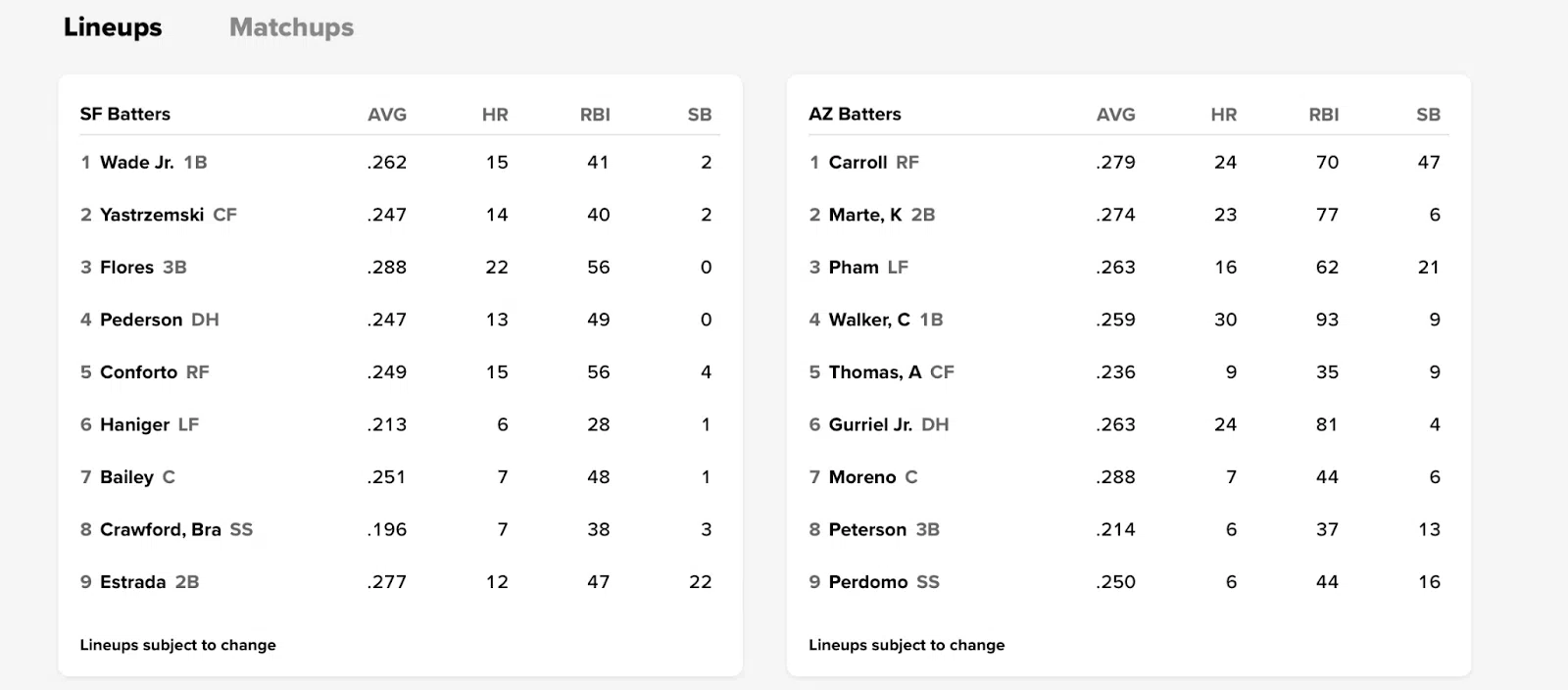 Both clubs have had thin starting rotations, but both are going with their co-aces. The Giants have historically struggled against Merrill Kelly, who’s pitching Wednesday. Alex Cobb, SF’s Tuesday starter, has a 4.68 second-half ERA and has been battling through a hip impingement. The Giants are just 13-17 in games Logan Webb has started, despite the righty’s Cy Young-caliber season. Zac Gallen is one of four NL pitchers with more Fangraphs WAR than Webb.