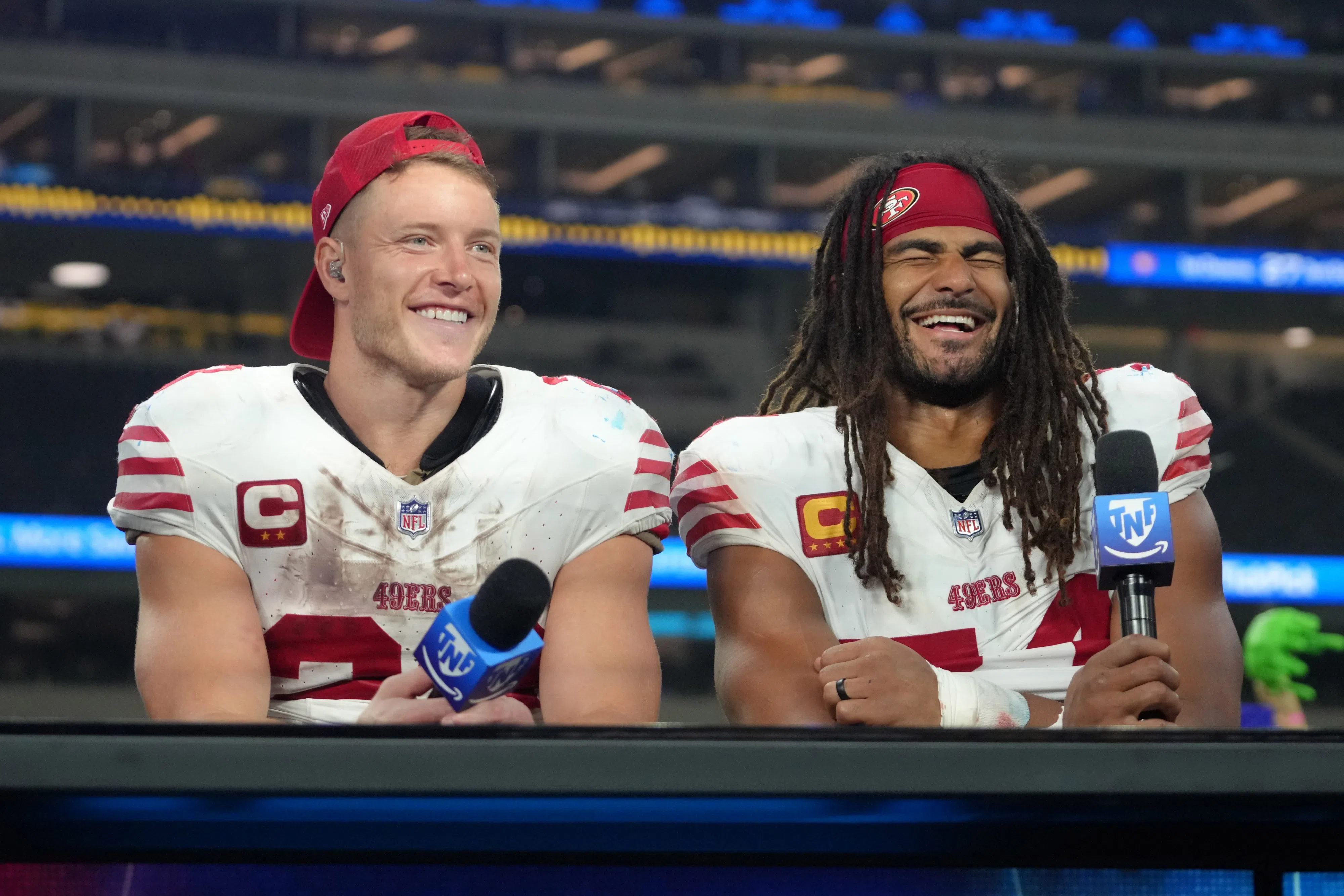 Oct 2, 2025; Inglewood, California, USA; San Francisco 49ers running back Christian McCaffrey (23) and middle linebacker Fred Warner (54) on the Prime Thursday Night Football set after the game against the Los Angeles Rams at SoFi Stadium. Mandatory Credit: Kirby Lee-Imagn Images