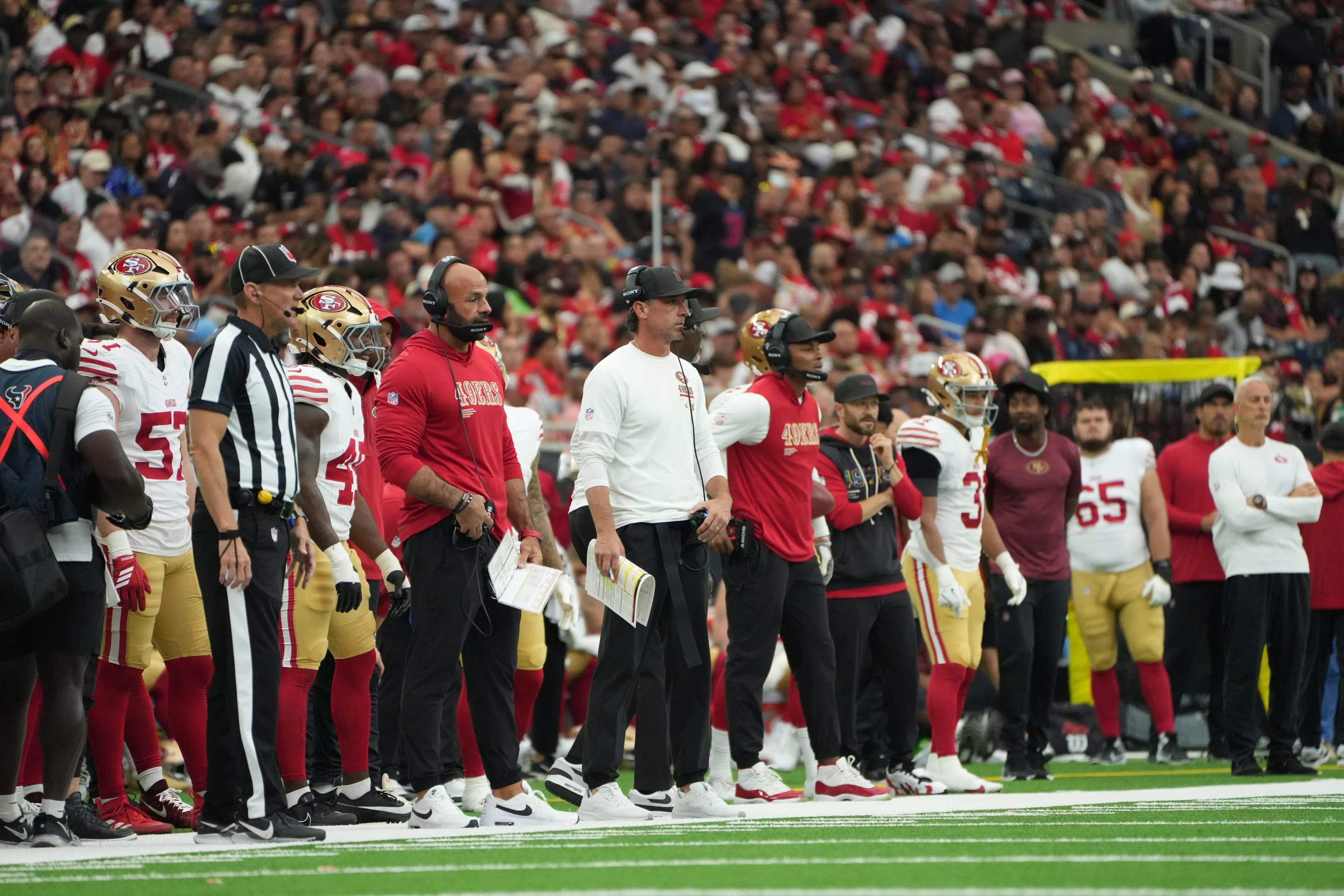 Oct 26, 2025; Houston, Texas, USA; San Francisco 49ers head coach Kyle Shanahan stands on the sidelines during the first half against the Houston Texans at NRG Stadium. Mandatory Credit: Sean Thomas-Imagn Images