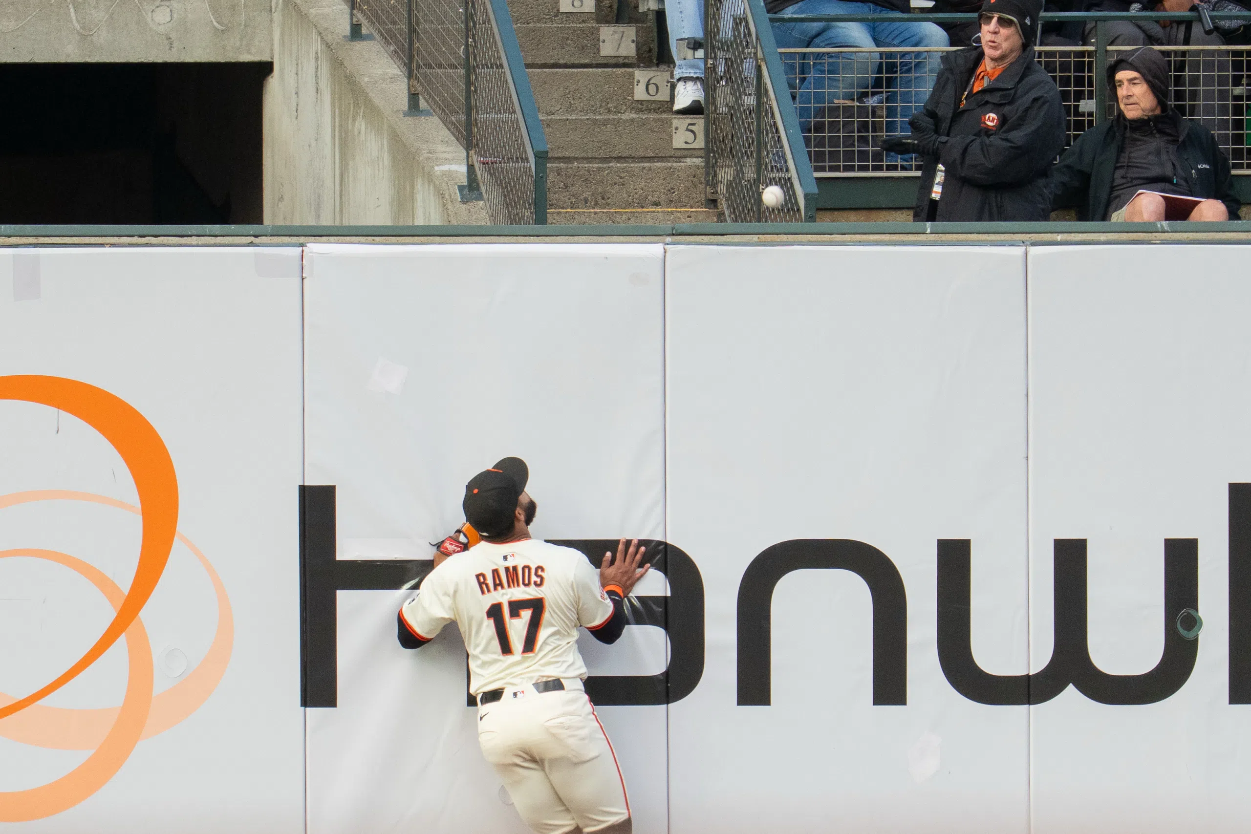 May 12, 2025; San Francisco, California, USA; San Francisco Giants left fielder Heliot Ramos (17) watches as the ball hit by Arizona Diamondbacks right fielder Corbin Carroll (not pictured) bounces ov...