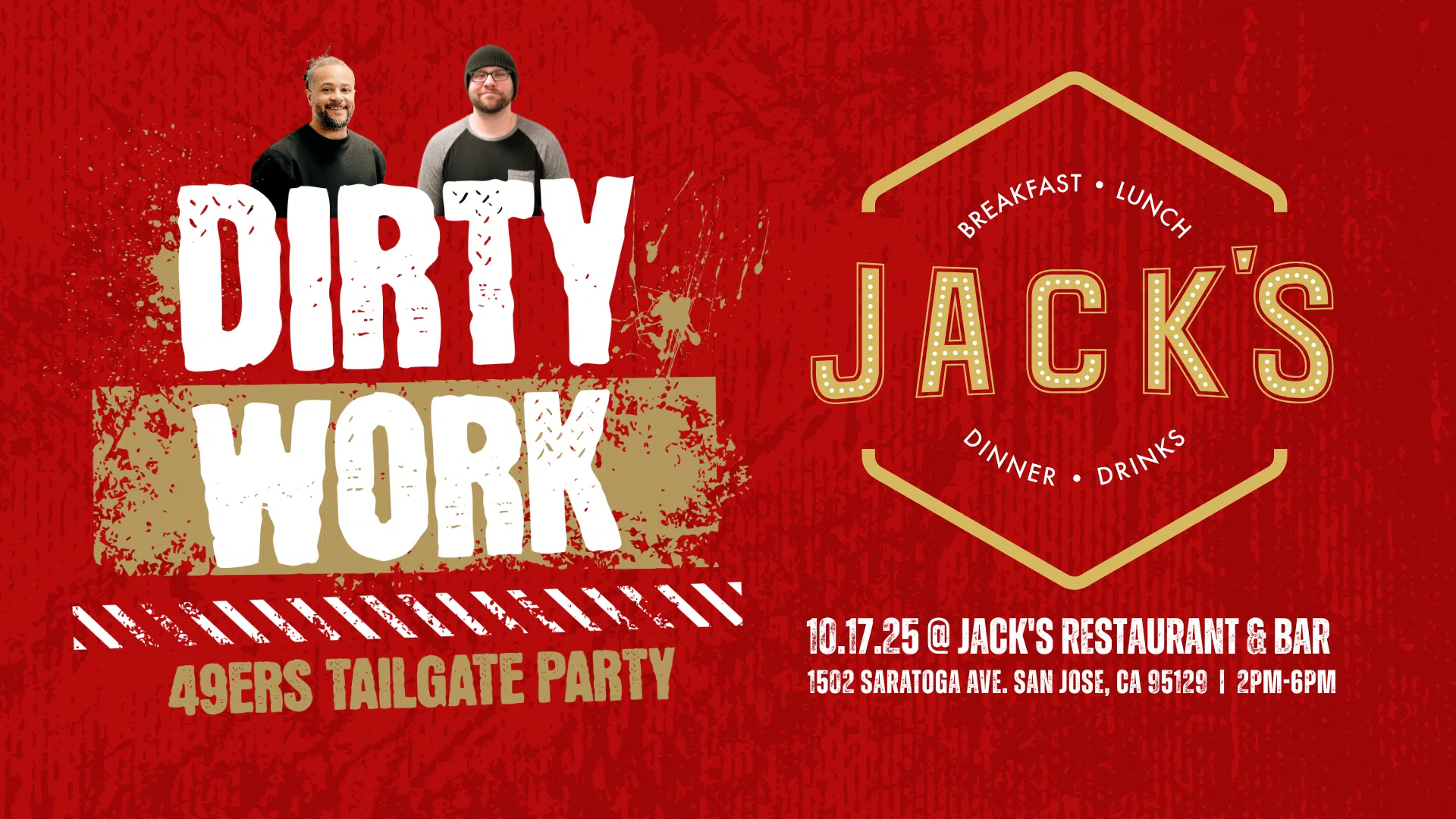 Join KNBR’s Dirty Work crew for a 49ers Tailgate Party and live broadcast on Friday, October 17th from 2–6PM at Jack’s Restaurant & Bar in San Jose’s Westgate Shopping Center (1502 Saratoga Ave). Get fired up for game weekend with Happy Hour starting early at 2PM, plus Modelo and Partida Tequila shot specials.