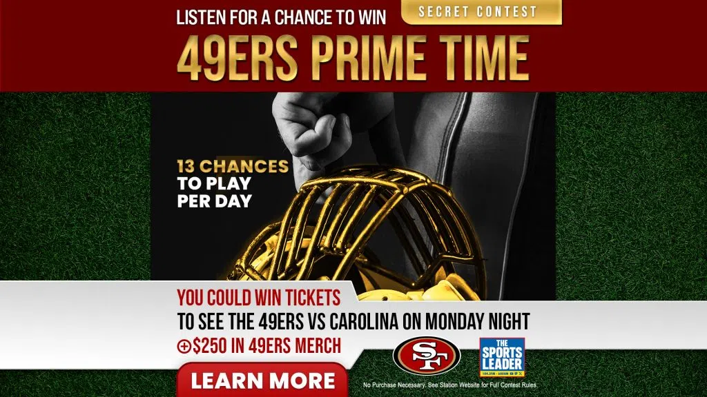 You’ve been selected to play in a Secret Contest! To thank you for listening to KNBR, The Sports Leader, we’re giving you a chance to win our 49ers Prime Time secret contest, where one lucky winner will score a pair of tickets to see the 49ers take on Carolina 11/24/25 in Santa Clara, plus $250 in 49ers merch! We want you to listen to more of 104.5 FM/680 AM KNBR, your official home of The San Francisco 49ers and San Francisco Giants. The more you listen, the more chances you have to WIN! There are 13 CHANCES to play every weekday.